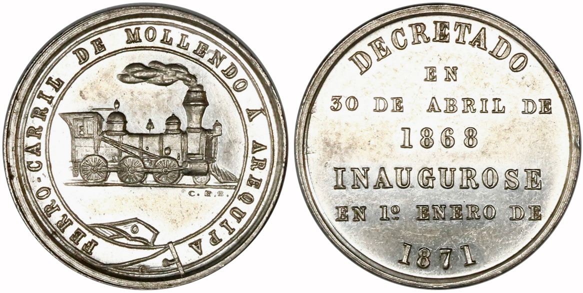 Peru, silver medal, 1871, Arequipa Railway Inauguration, NGC MS 63, ex-Cotoca Collection. Mayaux-439. 5.12 grams; 23 mm. Choice, lustrous piece with semi-prooflike fields, wispy surface hairlines on reverse, untoned. Pedigreed to the Cotoca Collection. NGC #4686273-001.