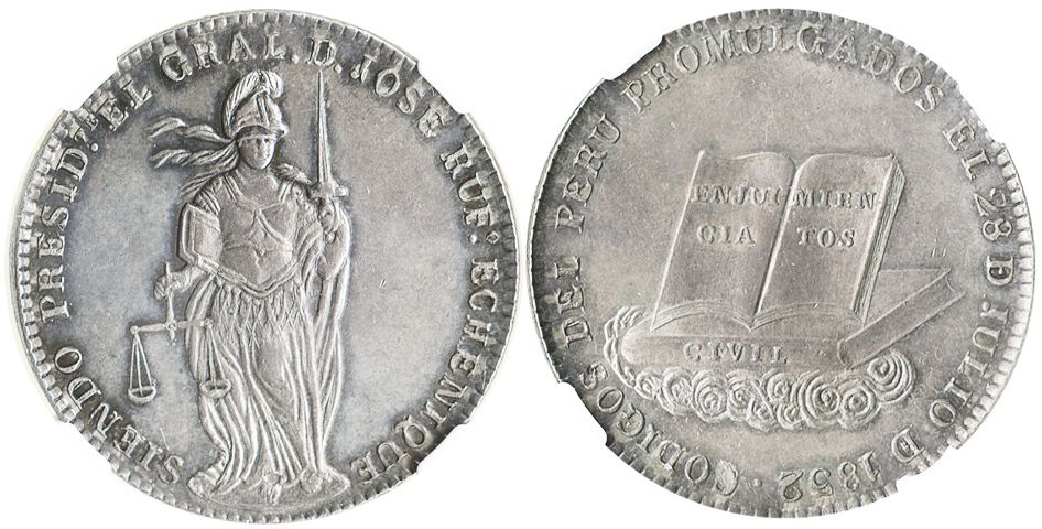 Peru, silver peso-sized medal, 1852, new laws under President Rufino Echenique, encapsulated NGC AU 58. Fonrobert-9096. 39mm; 27.5 grams. Obverse with standing Justice and legend SIENDO PRESIDTE EL GRAL. D. JOSE RUFO ECHENIQUE; reverse with open law book with EN JUI- / CIA / -MIEN / TOS on pages and CIVIL below inside legend CODIGOS DEL PERU PROMULGADOS EL 28 DE JULIO DE 1852. Beautifully toned, with hint of luster.