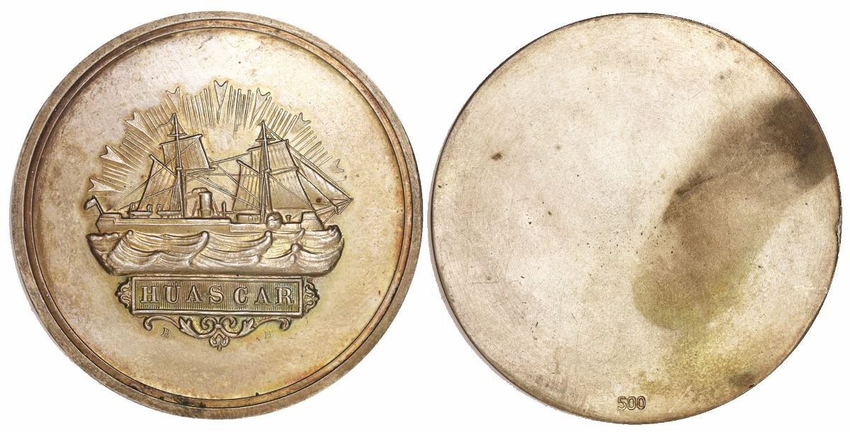 Peru, uniface silver medal (trial strike), ca. 1880, ironclad Huascar (War of the Pacific).