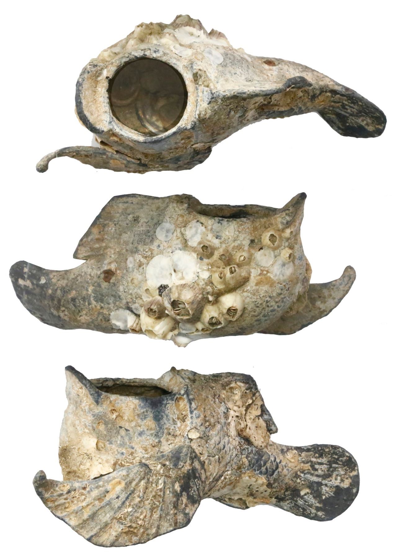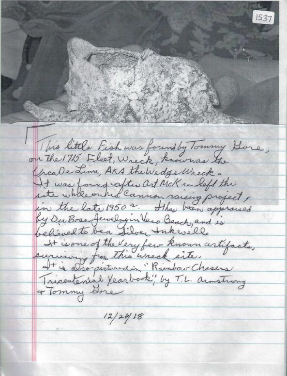 Pewter inkwell in the form of a fish, from the 1715 Fleet, ex-Gore, Rainbow Chasers Plate. 219 grams, 5" x 2-1/2" x 2". One of the very few artifacts from this 1715-Fleet wrecksite, found by state archeologist Tommy Gore and pictured on page 83 of Rainbow Chasers Tricentennial Yearbook (2015), by T. L. Armstrong and Tommy Gore. Small, artistic fish inkwell with one fin crafted as a base (head piece missing), scales all over, much sea encrustation (stable but delicate), a gorgeous piece for display. From the 1715 Fleet ("Wedge Wreck" site), found by Tommy Gore (state archeologist) in the late 1950s, accompanied by his personal letter.