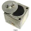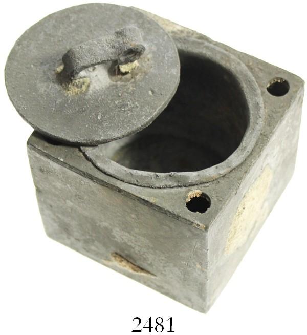 Pewter inkwell with lid, pictured in Diving to a Flash of Gold. 624 grams, 2-3/4" x 2-3/4" x 2-1/4". Perfectly preserved inkwell of a standard cubicle design with nib-holes in corners, separate handled lid over center cup, with patches of white encrustation here and there, important pedigree. From the Spanish 1733 Fleet, Florida Keys, pedigreed to the Marty Meylach collection.