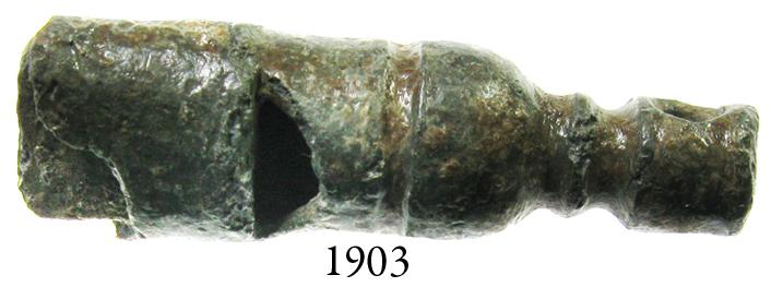 Pewter ship's whistle, 1500s-1600s. 19 grams, 1-3/4" long. Small, cylindrical whistle with hole at one end for wearing on a chain, chip in other end but otherwise intact, dull dark gray in color. With certificate.