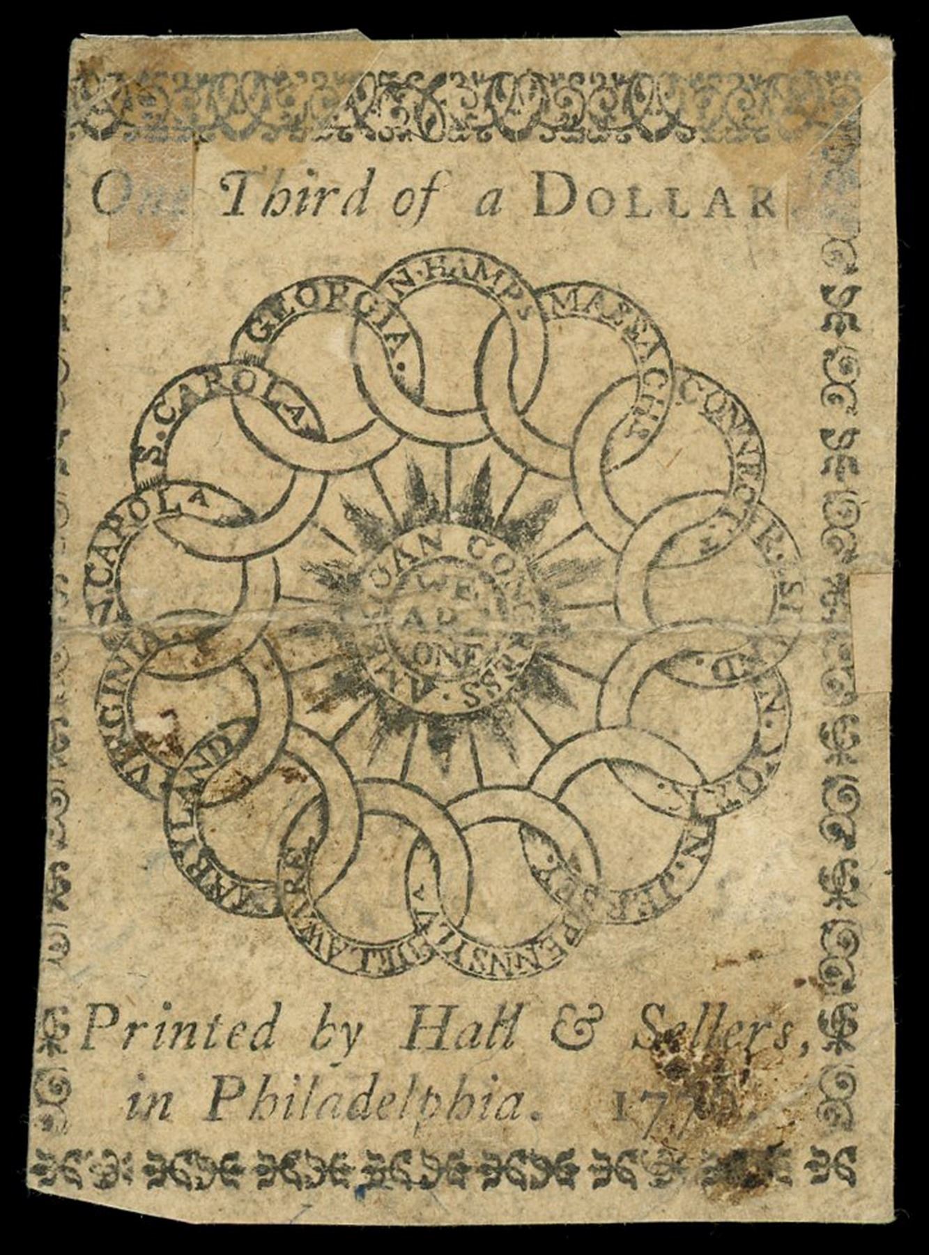 Philadelphia, Continental Congress, $1/3, Feb. 17, 1776, serial not visible.