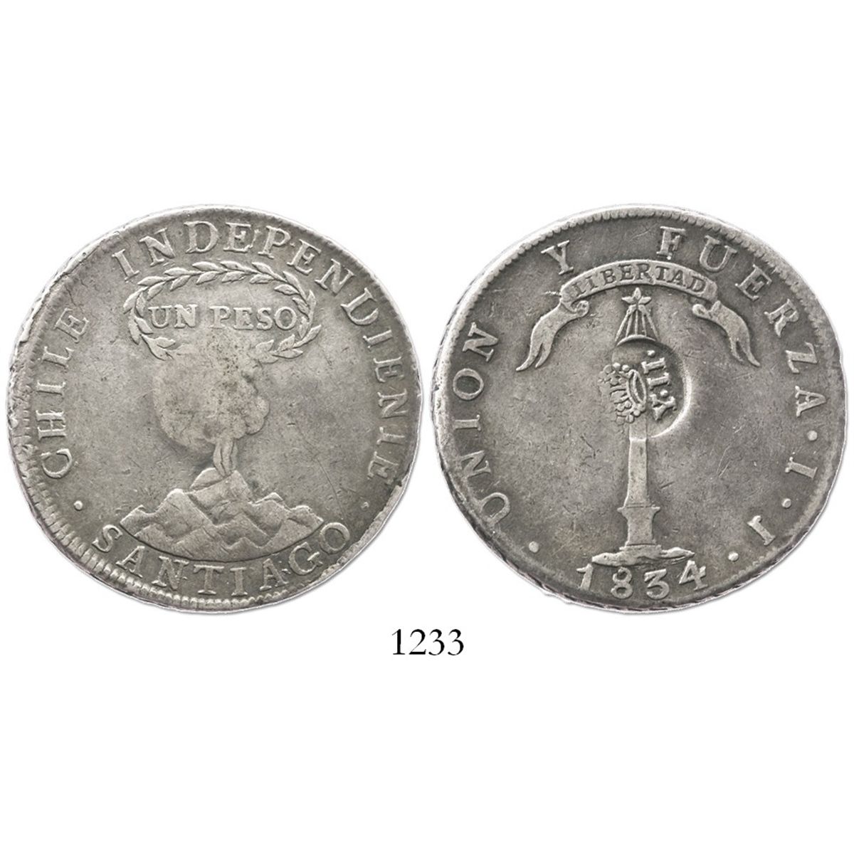 Philippines, 8 reales, Isabel II, "Y•II" countermark (Type VI, 1834-37) on Santiago, Chile, "volcano" peso, 1834IJ. KM-108; CT-451. 27.0 grams. Better assayer for the date, host and countermark VF with muted luster and toning, slightly crude rims (as made).