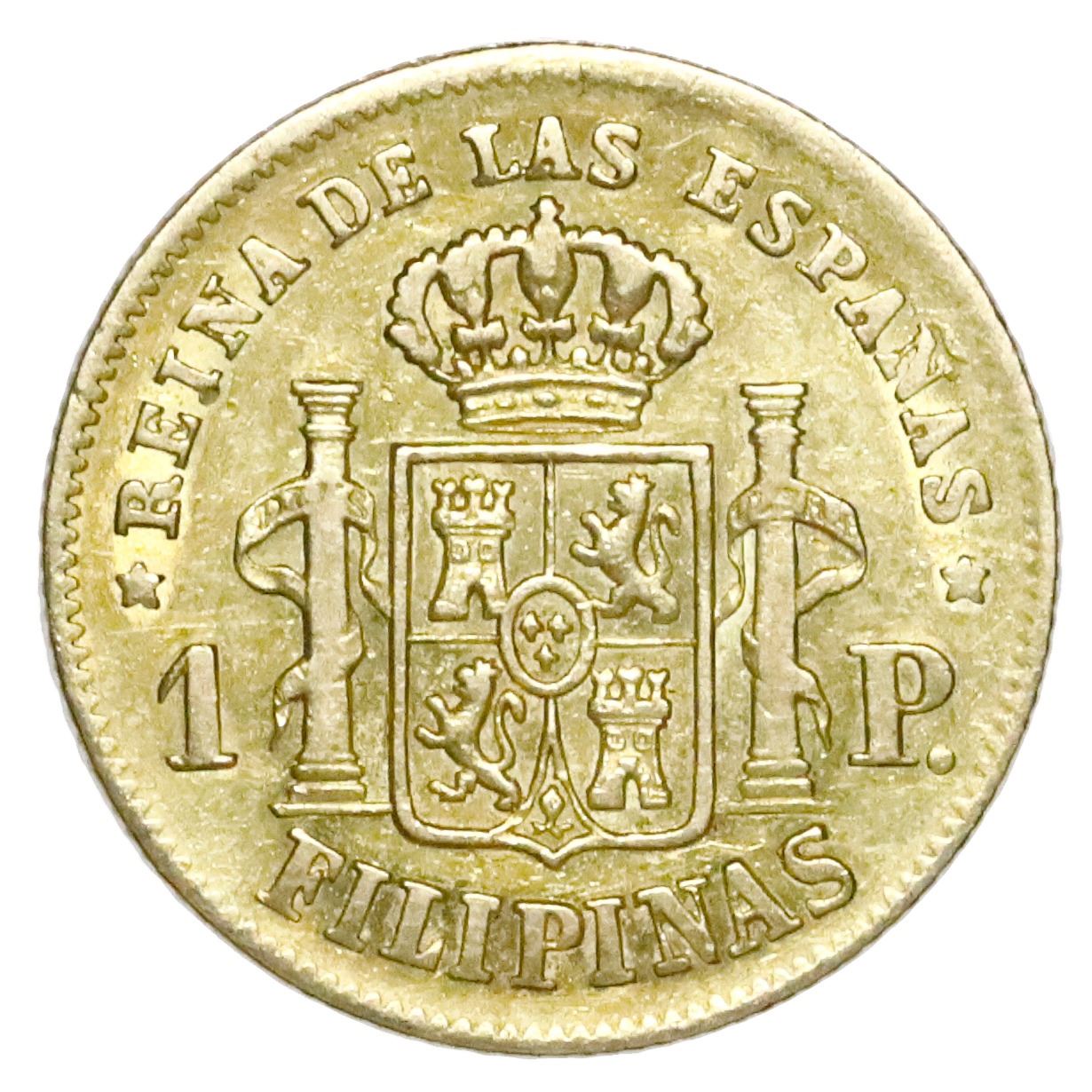 Philippines, gold 1 peso, Isabel II, 1865. Cal-829; KM-142. 1.68 grams. Fine with surface hairlines.