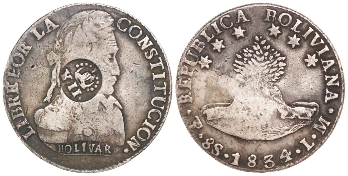 Philippines (under Spain), 8 reales, Isabel II, crowned "Y.II." countermark (1834-7) on a Potosi, Bolivia, 8 soles, 1834LM. KM-100. 26.83 grams. Richly toned AVF with underlying luster, bagmarks, full countermark.