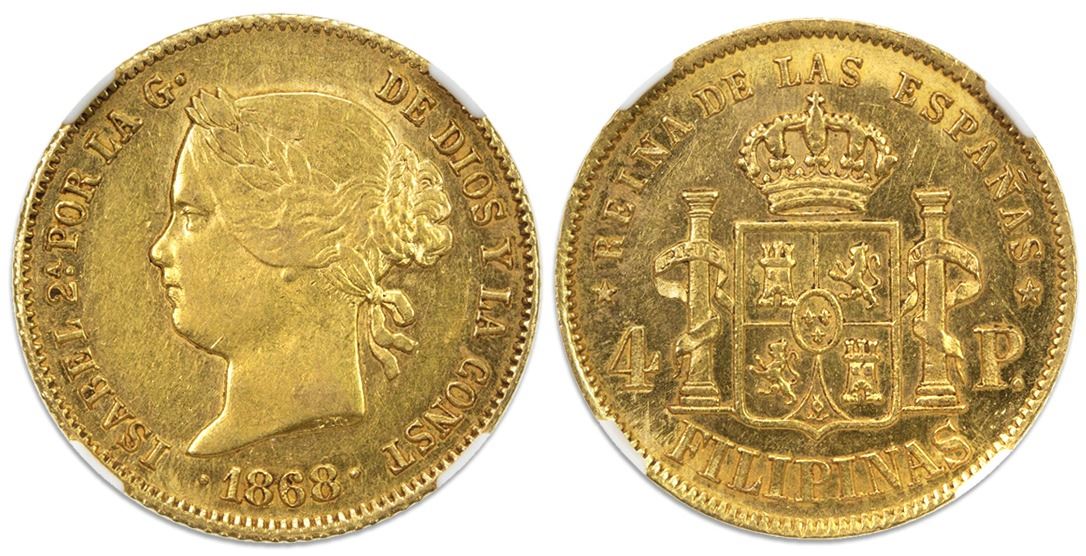 Philippines (under Spain), gold 4 pesos, Isabel II, 1868, NGC AU 55. Cal-865; KM-144. Good luster for the grade, with light high-point wear and minimal marks, struck with frozen date in 1868-73, during Spain's period of civil war, temporary/disputed monarchs and provisional government (Isabel was deposed in 1868). NGC #4835633-010.