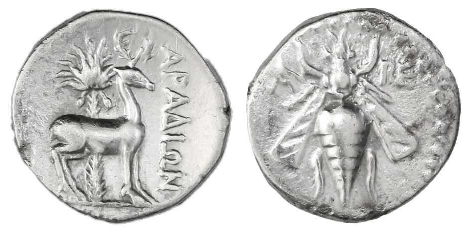 Phoenicia, Arados, AR drachm, 172/1-111/0 BC, dated CY 91 (169/8 BC), "bee." DCA 774; HGC 10, 63. 3.81 grams. Bee with straight wings, date (in monogram form) right, RE monogram right / Stag standing right before palm tree. Brightly toned VF, full details and well centered.