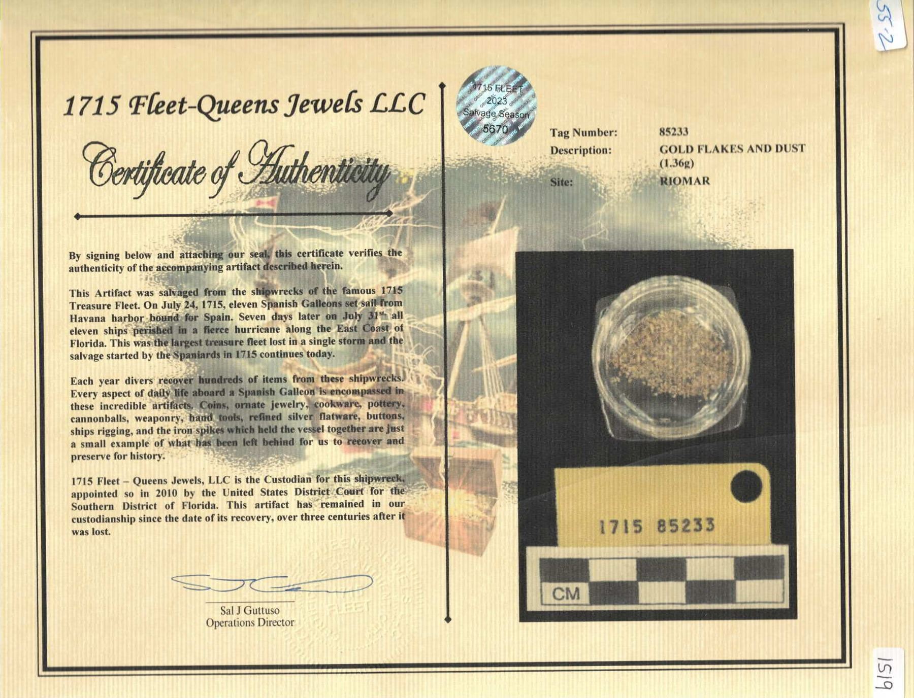 Pinch of gold flakes and dust, 1.36 grams total, ex-1715 Fleet (Riomar). 1.36 grams total. Tiny bits of gold dust encased in a clear, square Lucite box for display. From the 1715 Fleet, with original Queens Jewels LLC tag and photo-certificate 85233.