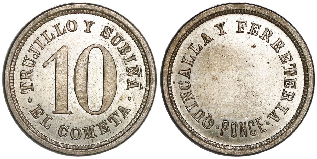 Ponce, Puerto Rico, copper-nickel 10 centavos token, no date (late 1800s), El Cometa (de) Trujillo y