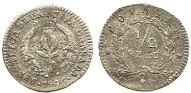 Popayan, Colombia, 1/2 real, 1846UE. Restrepo-178.24; KM-96.2 1.3 grams. VF with decent toning, slightly crude rims (as made).
