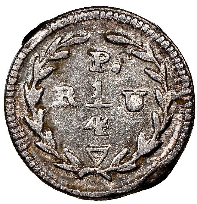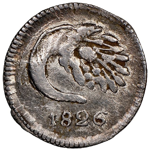 Popayan, Colombia, 1/4 real, 1826RU, rare, NGC AU 55. Restrepo-147.1; KM-85.3. Bold but crude details, nearly full rims, toned all over (good contrast), commonest date of a generally rare type. NGC #3711594-017. Pedigreed to the Esmeralda Collection (stated on special label).