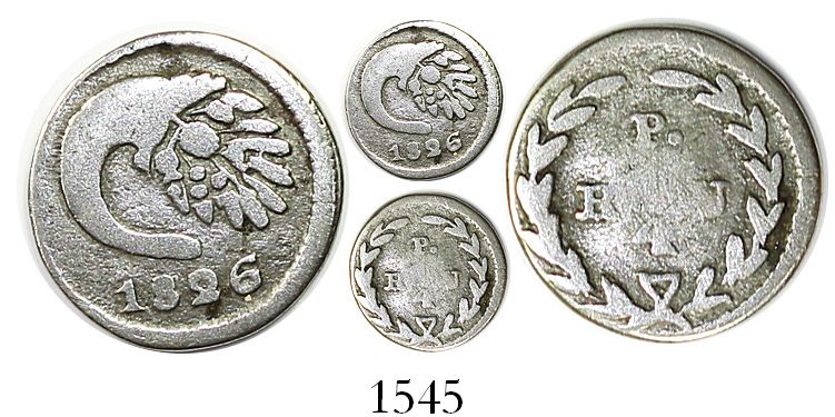 Popayan, Colombia, 1/4 real, 1826RU. Restrepo-147.1; KM-85.3. 0.68 gram. Toned Fine with weak center on reverse, which is slightly off-center.