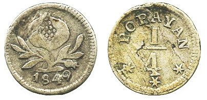 Popayan, Colombia, 1/4 real, 1849. Restrepo-175.1; KM-108.2. 0.8 gram. Decent AVF but with some planchet-flaws (lamination).