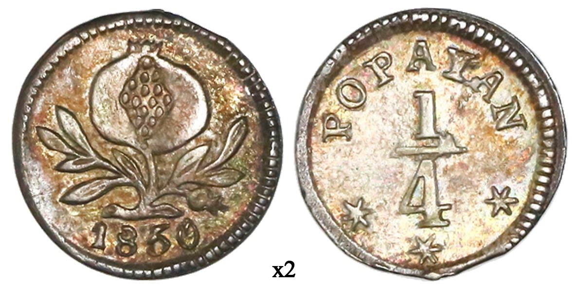 Popayan, Colombia, 1/4 real, 1850. Restrepo-175.3; KM-108.2. 0.79 gram. Richly rainbow toned over lustrous surfaces with no marks or notable wear (AU+), slightly crude rims (as made).