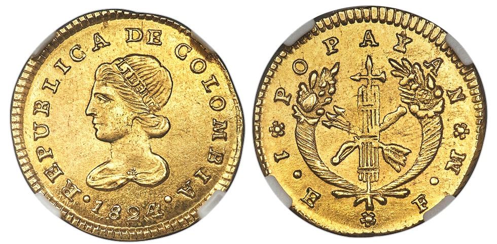Popayan, Colombia, 1 escudo, 1824FM, NGC MS 63, finest known in NGC and PCGS censuses, with silver WINGS sticker. Restrepo-162.3; Sed-3; KM-81.2. Bold strike and great luster for the type, with much more detail visible on Liberty's head than usual, not just finest known (the best of twenty entries in the NGC census, with the only two at PCGS being MS62) but also top grade for the entire denomination with the exception of a single Bogota 1823 at MS 64 NGC #2825641-001.