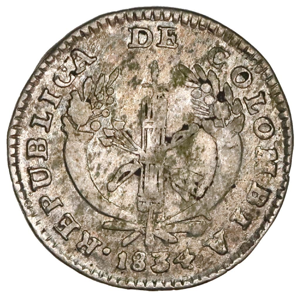 Popayan, Colombia, 1 real, 1834RU, rare, NGC VF details / cleaned. Restrepo-154.20; KM-87.2. Broad flan with full rims, crude inner details with tiny black bits in crevices and light streaks (dull) against silvery surfaces, rare key date (last of type) for this denomination. NGC #5938641-002. Pedigreed to the Nueva Granada collection (stated on label).
