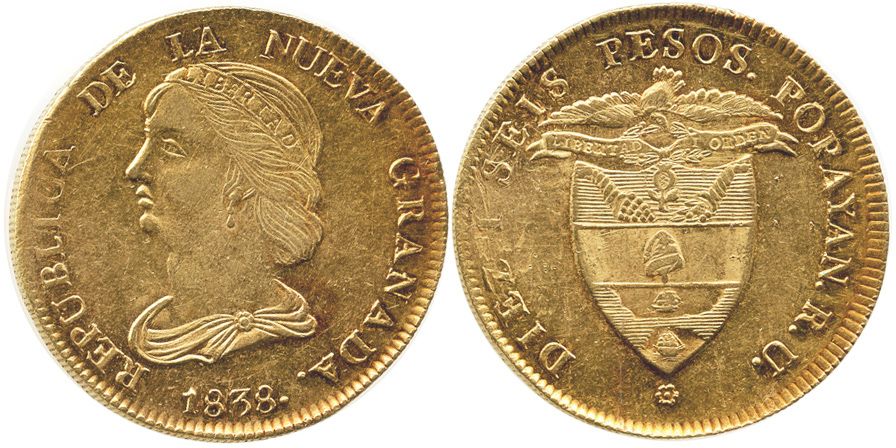 Popayan, Colombia, 16 pesos, 1838RU. Sedwick-19; Restrepo-212.3; KM-94.2. 27.0 grams. AU with luster and toning, very light surface hairlines.