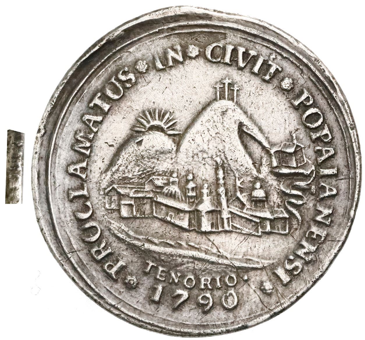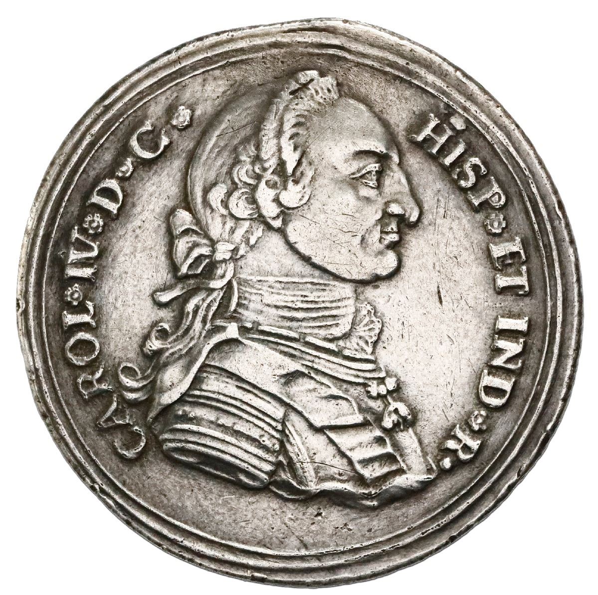 Popayan, Colombia, 4 reales proclamation medal, 1790, Tenorio, corded edge, NGC XF details / plugged. Restrepo-p. 121; Herrera-186; Medina-213. 13.41 grams; 33mm. Choice strike on a very broad flan with steely toning, a few marks and light weak, the stated plug virtually imperceptible. NGC #5931969-005. Pedigreed to the Nueva Granada collection (stated on label).