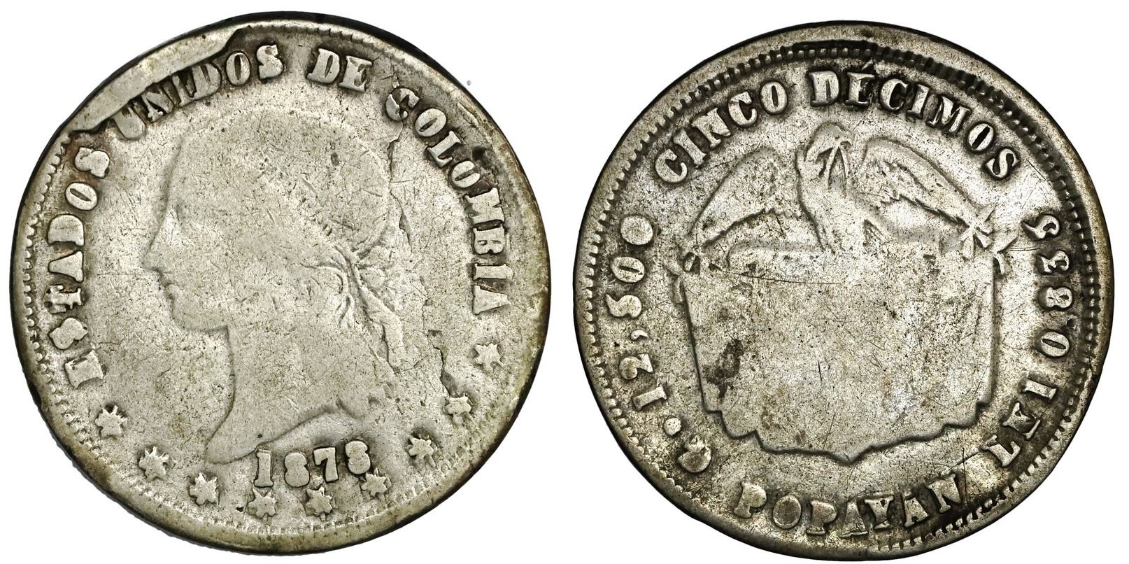 Popayan, Colombia, 5 decimos, 1878, rare, PCGS F12.