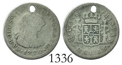 Popayan, Colombia, bust 1/2 real, Charles III, 1774JS. R-34.2; KM-45.2. 1.6 grams. About Fine with hole at top, lightly toned all over, scarce one-year type.