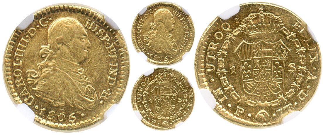 Popayan, Colombia, bust 1 escudo, Charles IV, 1805JT, encapsulated NGC AU 53. 85.32; CT-538; KM-56.2. Scarce grade (second finest known graded by NGC), highly lustrous, the reverse slightly off-center and the rims slightly crude as a result.