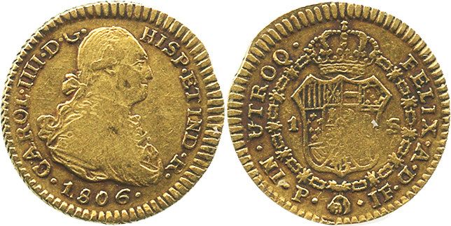 Popayan, Colombia, bust 1 escudo, Charles IV, 1806JF. Restrepo-85.34; KM-56.2; CT-539. 3.4 grams. Decent VF with weak centers, crude rims (as made), toning around details.