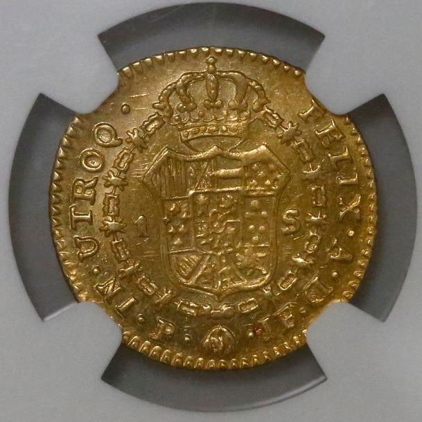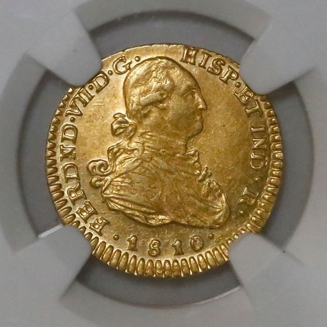 Popayan, Colombia, bust 1 escudo, Ferdinand VII (bust of Charles IV), 1810JF, NGC AU 58. Restrepo-122.5; CT-308; KM-64.2. Tied with one other for second finest known in NGC census, only one higher in MS 62. Very lustrous with shiny, orange toned fields, obverse struck slightly off-center. NGC #2803345-012.
