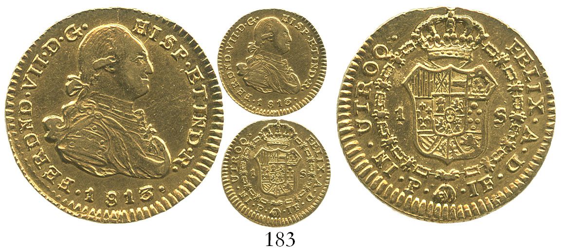 Popayan, Colombia, bust 1 escudo, Ferdinand VII (bust of Charles IV), 1813/2JF. Restrepo-123.10; KM-64.2; CT-unl. 3.4 grams. Choice AU+ with nice luster, slightly off-center strike.