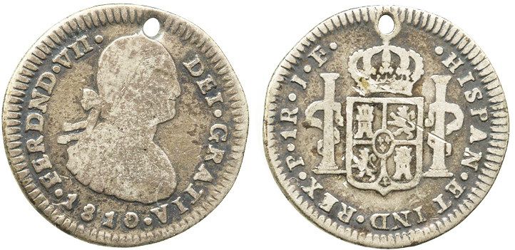 Popayan, Colombia, bust 1 real, Ferdinand VII (bust of Charles IV), 1810JF. Restrepo-112.1; KM-68.1; CT-1190. 3.1 grams. Nice Fine+ with rich old toning, good rims, holed at top.