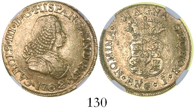 Popayan, Colombia, bust 2 escudos, Charles III (bust of Ferdinand VI), 1762J, encapsulated NGC AU 53. Restrepo-58.6; KM-36.2; CT-495. Scarce type, good details and luster but with bagmarks, slightly off-center strike. Pedigreed to the Soler y Llach auction of October 2013, lot #546.