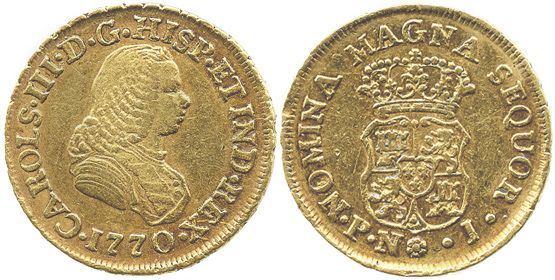 Popayan, Colombia, bust 2 escudos, Charles III (bust of Ferdinand VI), 1770J. Restrepo-58.16; CT-500; KM-36.2. 6.8 grams. Attractively red-toned XF, no problems, scarce.