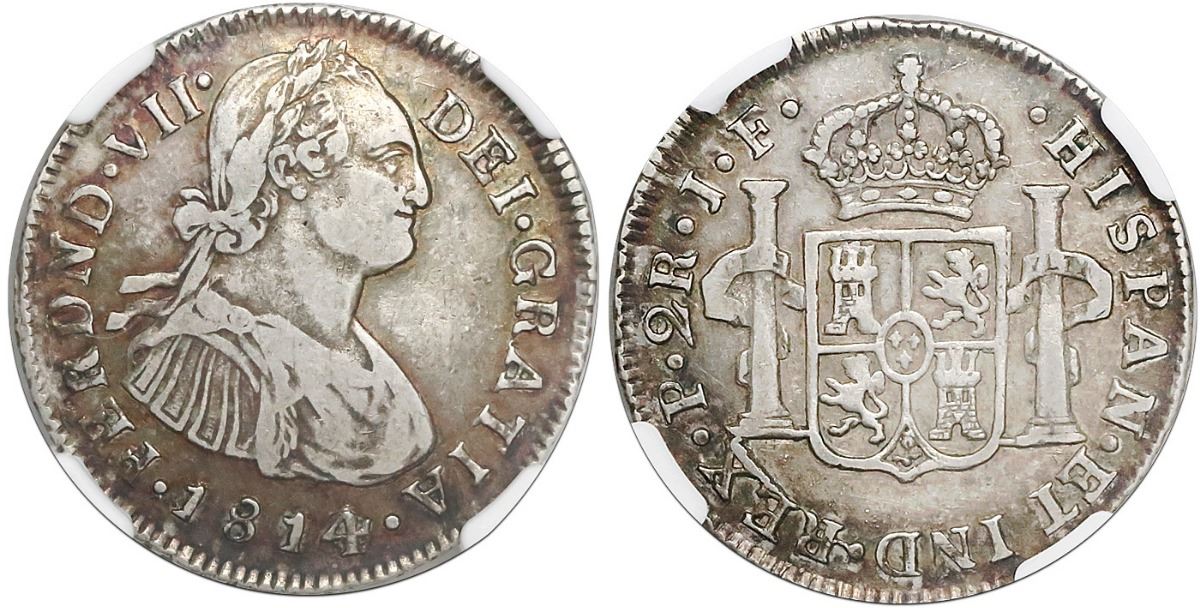 Popayan, Colombia, bust 2 reales, Ferdinand VII, 1814/3JF, rare, encapsulated NGC VF 25, finest and only specimen in NGC census, ex-Ortiz Murias. KM-70.2; Restrepo-114.6; CT-978. 6.7 grams. Attractively rainbow-toned fields over luster, very nice strike and problem-free, fully XF or better in our opinion (friction on high points only), in any case choice and considered the rarest date of the Popayan 2R, desirable pedigree. NGC certification number 3355323003. Pedigreed to the Jorge Ortiz Murias collection of Colombian colonial minors (our Auction #11, lot #1067).