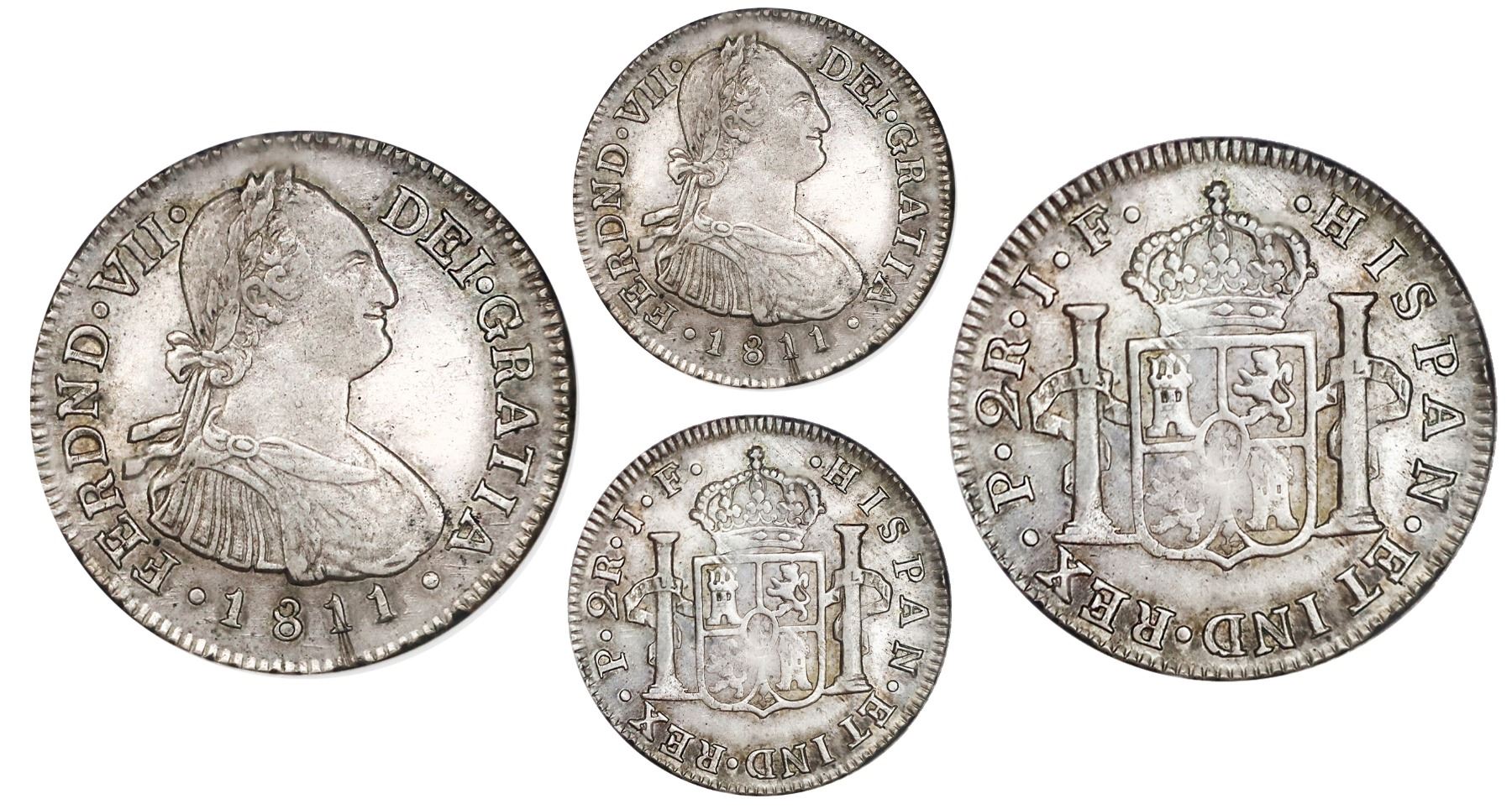 Popayan, Colombia, bust 2 reales, Ferdinand VII (bust of Charles IV), 1811JF, NGC AU 55, ex-Whittier (stated on label). Restrepo-114.3; KM-70.2; Cal-897. Bold strike except for center of reverse, very lightly toned over muted luster, interesting struck-through-fiber error at penultimate digit of date. NGC #302851-009. Pedigreed to the Whittier collection.