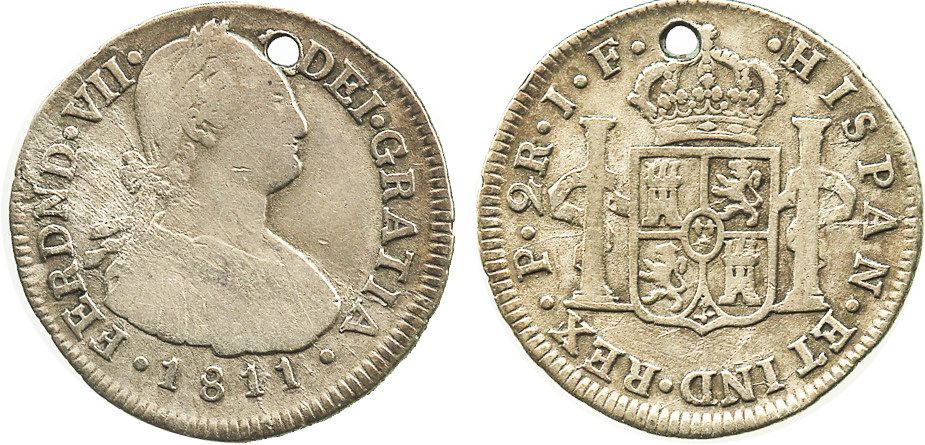 Popayan, Colombia, bust 2 reales, Ferdinand VII (bust of Charles IV), 1811JF. Restrepo-114.3; KM-70.2; CT-unlisted (cf. 975). 6.7 grams. AVF with toning around letters, holed at edge.