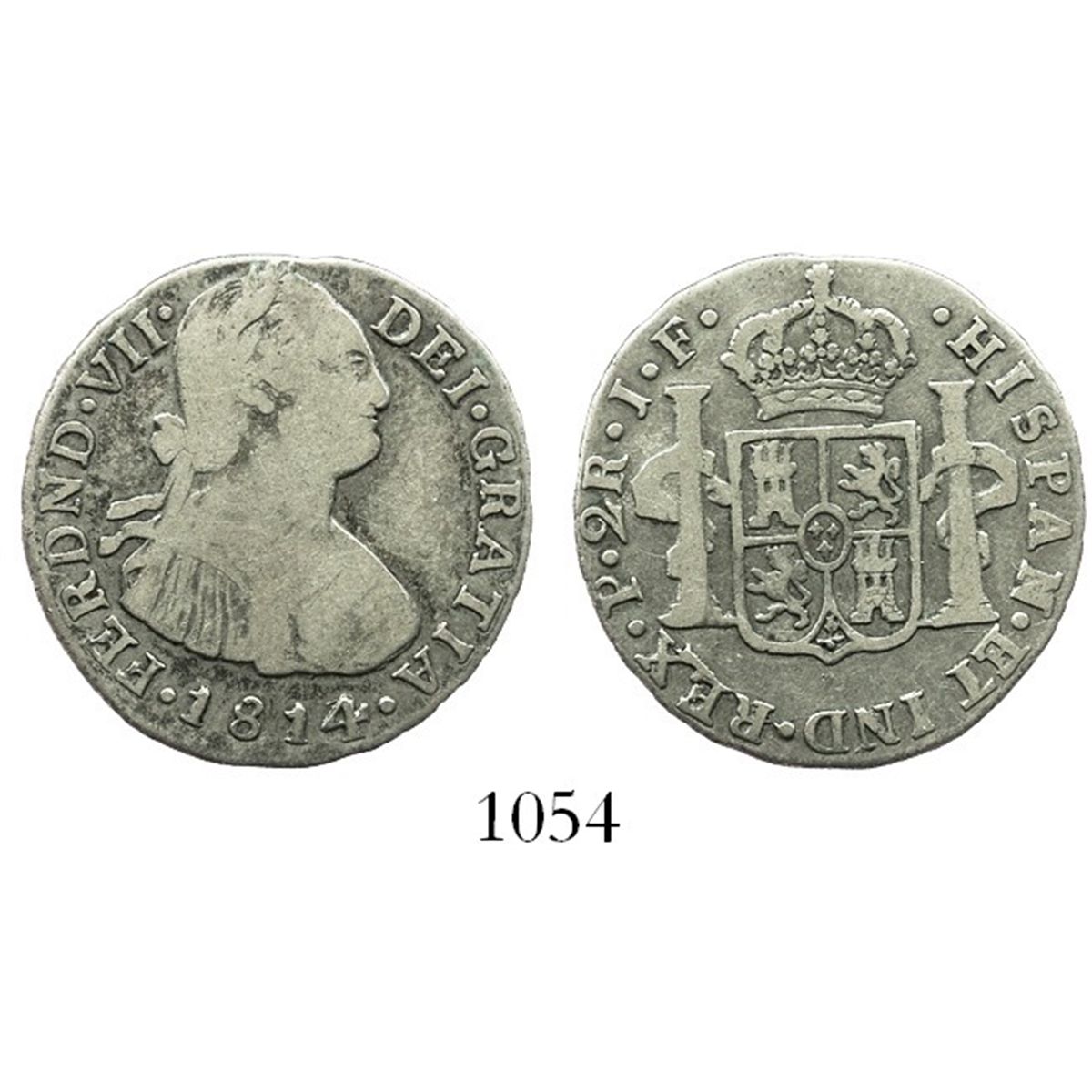 Popayan, Colombia, bust 2 reales, Ferdinand VII (bust of Charles IV), 1814JF, rare.