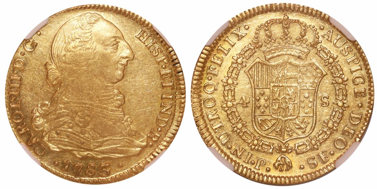 Popayan, Colombia, bust 4 escudos, Charles III, 1783SF, encapsulated NGC AU 50, finest known in NGC census. Restrepo-68.16; CT-360; KM-44. Weak centers (with adjustment marks on reverse but choice luster for slab grade, light red color.