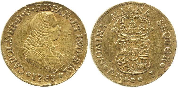 Popayan, Colombia, bust 4 escudos, Charles III (bust of Ferdinand VI), 1769J. Restrepo-64.8; CT-351; KM-37. 13.2 grams. AXF with crude rims (as made), filed edge as ex-jewelry, light toning, scarce type.