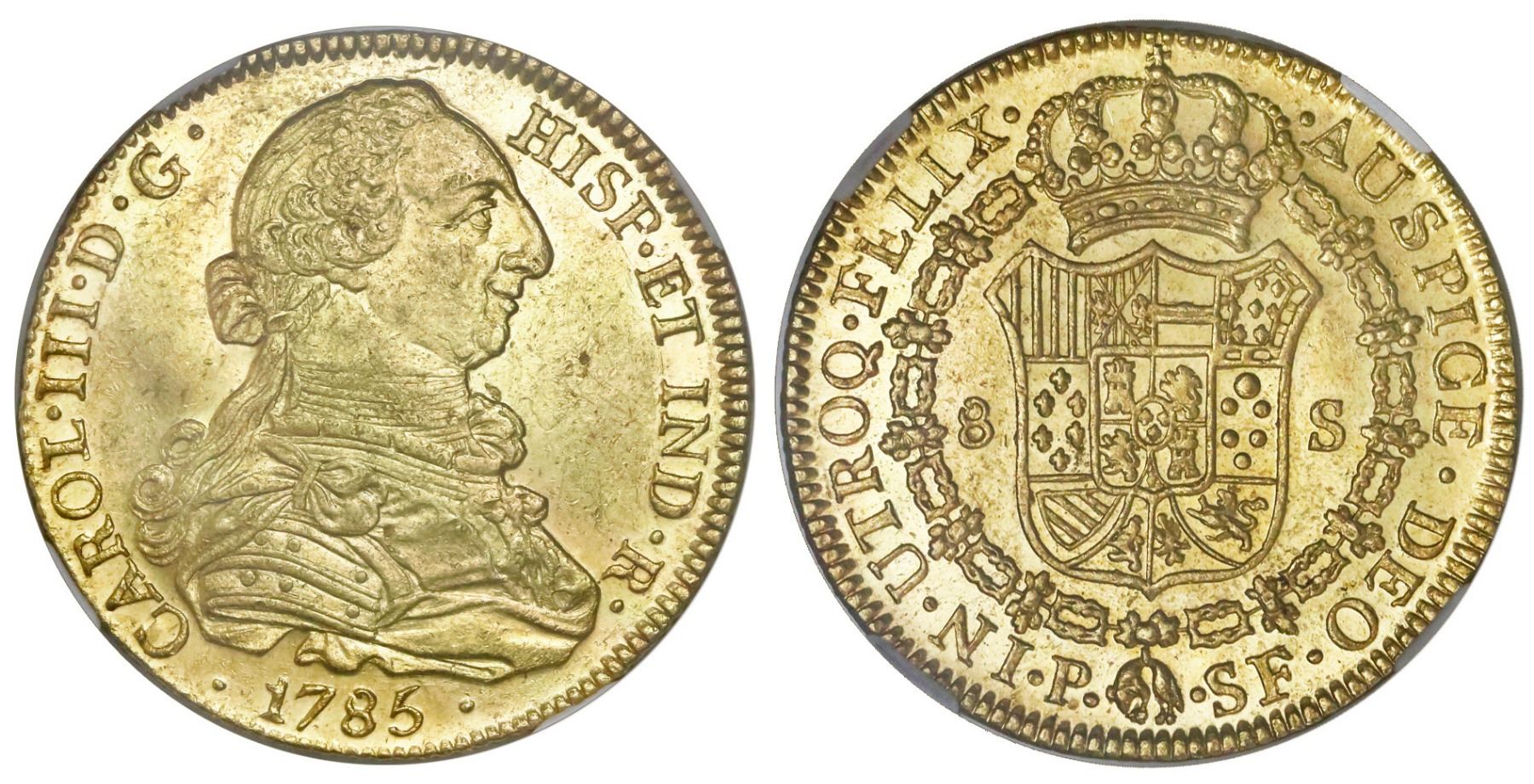 Popayan, Colombia, bust 8 escudos, Charles III, 1785SF, NGC MS 61, tied for finest known in NGC census. Restrepo-73.36; CT-138; KM-50.2a. Bold strike and brilliant luster, minor marks on obverse only, tied with just one other in MS for top honors at NGC (and with no MS recorded at PCGS). NGC #3932777-003.