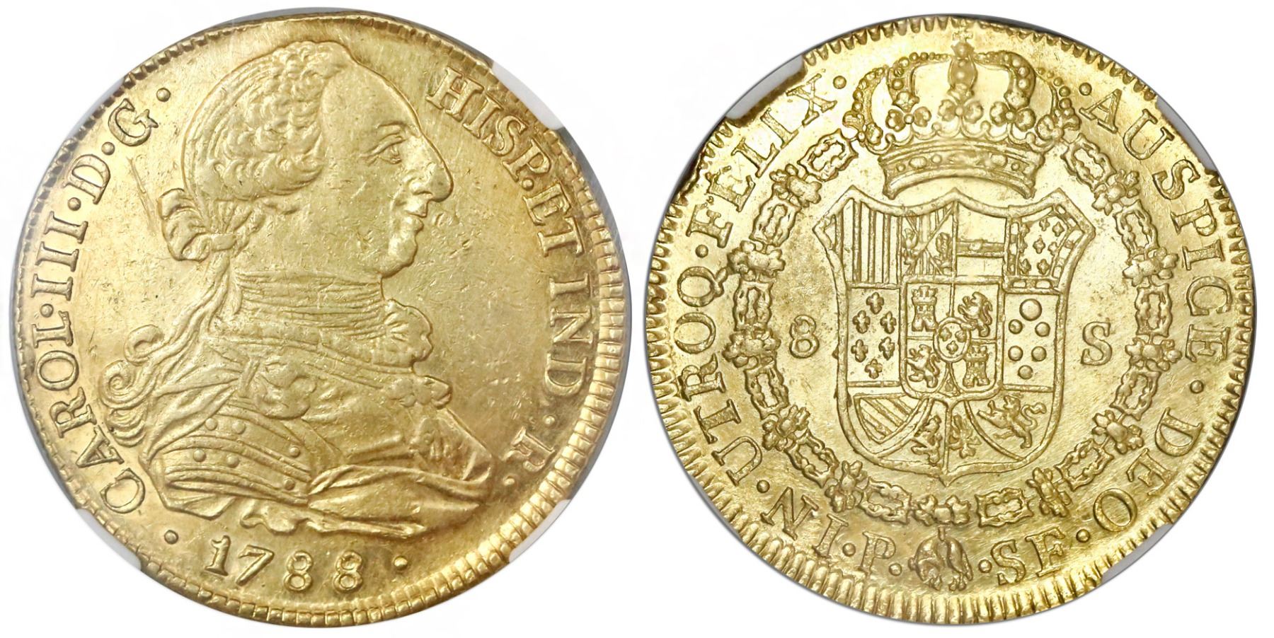 Popayan, Colombia, bust 8 escudos, Charles III, 1788SF, NGC AU 53. Restrepo-73.42; CT-141; KM-50.2a. Lustrous and choice but with just a few too many minor marks on obverse to make MS (should be AU 58 in our opinion), light yellow color. NGC #4694337-006.