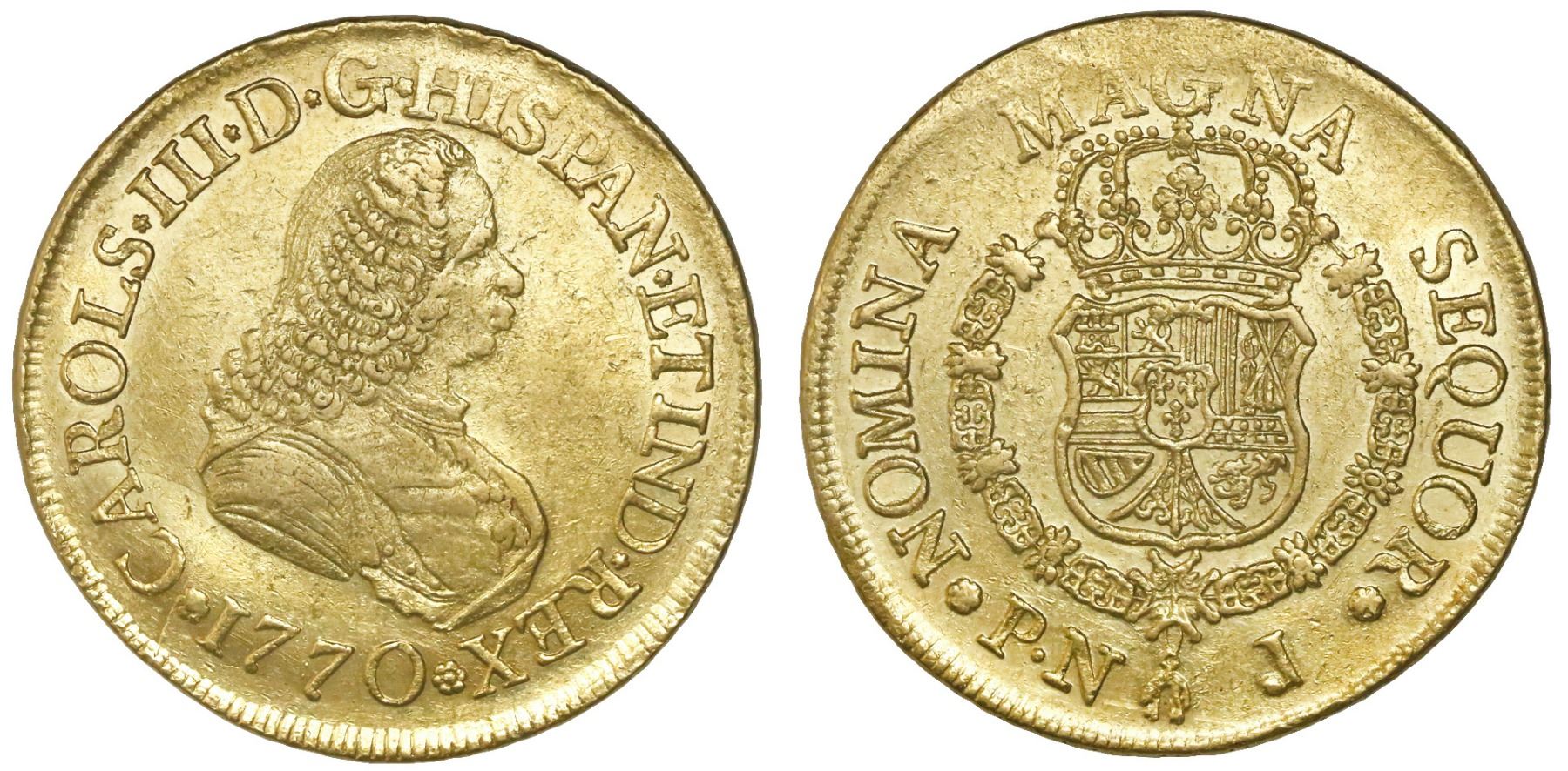 Popayan, Colombia, bust 8 escudos, Charles III (bust of Ferdinand VI), 1770J. Restrepo-70.20; CT-121; KM-38.2. 26.97 grams. Lustrous AU+ in light yellow gold with slightly rough obverse fields and top of reverse rim crude, flashy overall.
