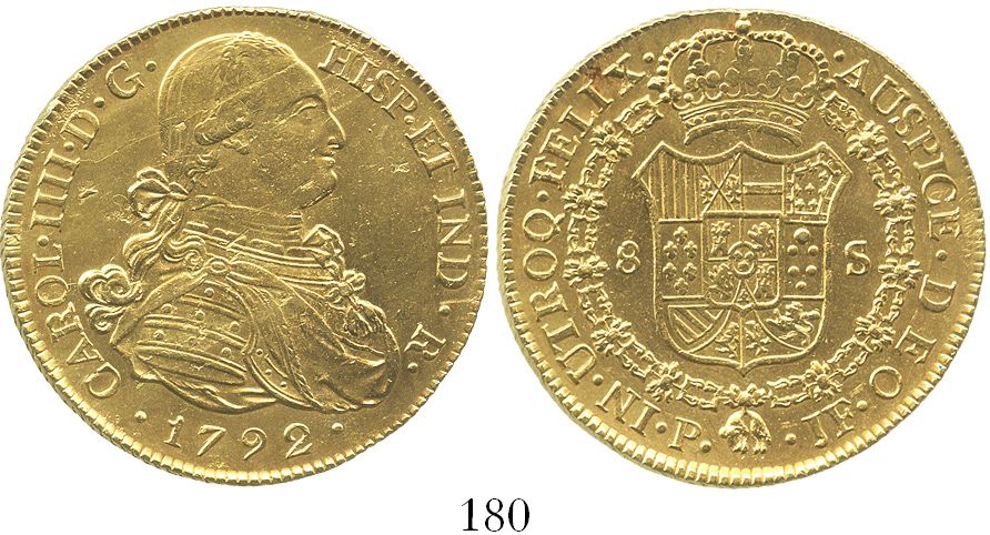 Popayan, Colombia, bust 8 escudos, Charles IV, 1792JF. Restrepo-98.4; KM-62.2; CT-70. 27.0 grams. Bold UNC details but cleaned and lightly polished, nice strike, just a few minor marks.
