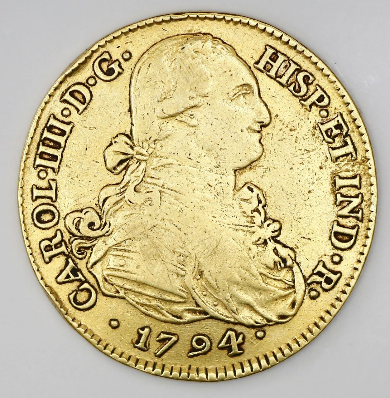 Popayan, Colombia, bust 8 escudos, Charles IV, 1794JF. Restrepo-98.8; CT-72; KM-62.2. 26.85 grams. Cleaned VF with smoothed edge, encrustation around lettering.