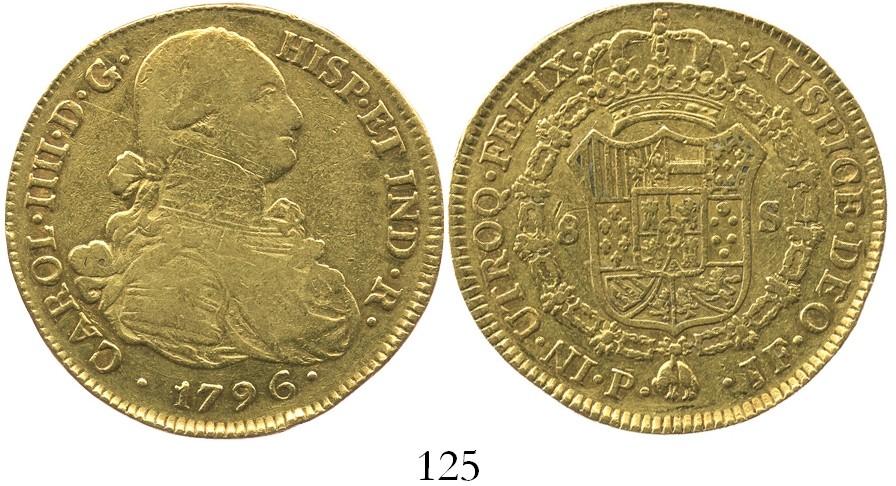 Popayan, Colombia, bust 8 escudos, Charles IV, 1796JF. KM-62.2; CT-75. 26.8 grams. Lightly cleaned VF/XF, lustrous in legends. Pedigreed to the Craig A. Whitford auction of November 29, 1993, with lot-tag #366.