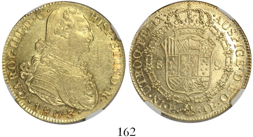 Popayan, Colombia, bust 8 escudos, Charles IV, 1803JF, encapsulated NGC AU 55. KM-62.2; CT-82 ;Restrepo-98.26. Totally under-graded coin, as it is fully Mint State with flashy luster on both sides, nicely struck too, just a little weak on the high points, clearly mistaken for wear.