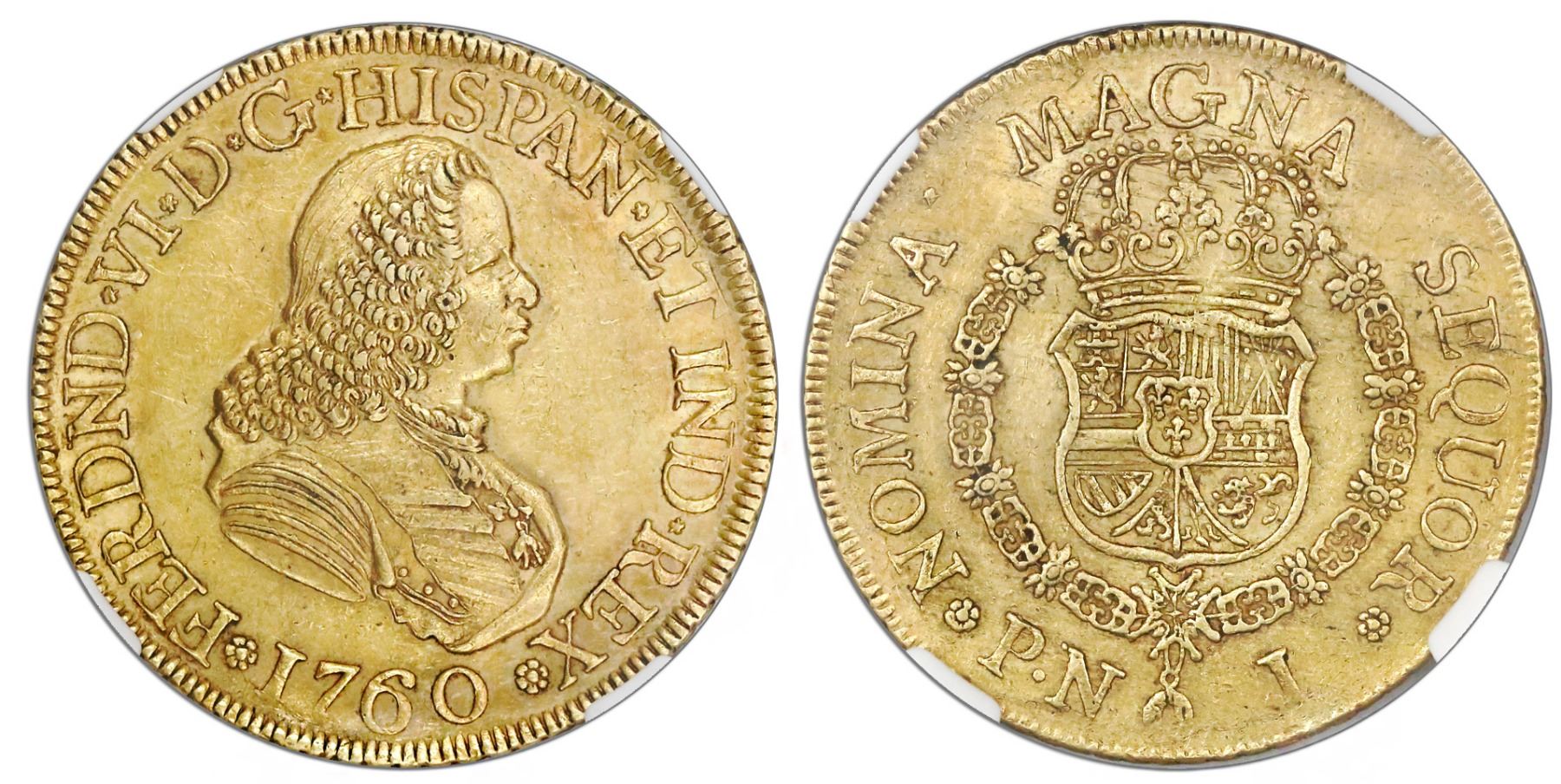 Popayan, Colombia, bust 8 escudos, Ferdinand VI, 1760J, mintmark P.N, NGC AU 58. Restrepo-26.6; CT-48; KM-32.2. Toned and well struck (fully detailed), practically no wear but without luster, rare posthumous issue and key date of this three-year type. NGC #4673322-001.