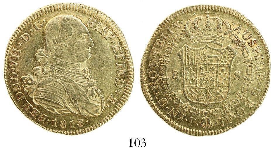 Popayan, Colombia, bust 8 escudos, Ferdinand VII (bust of Charles IV), 1813JF. Restrepo-128.11; CT-73; KM-66.2. 26.99 grams. Lustrous AU- nice strike, just the edge a little crude (as made).