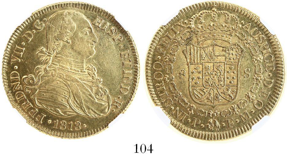 Popayan, Colombia, bust 8 escudos, Ferdinand VII (bust of Charles IV), 1818FM, encapsulated NGC AU 55. Restrepo-128.31; CT-81, KM-66.2 . Nice luster and strike, just a few hairlines away from AU 58.