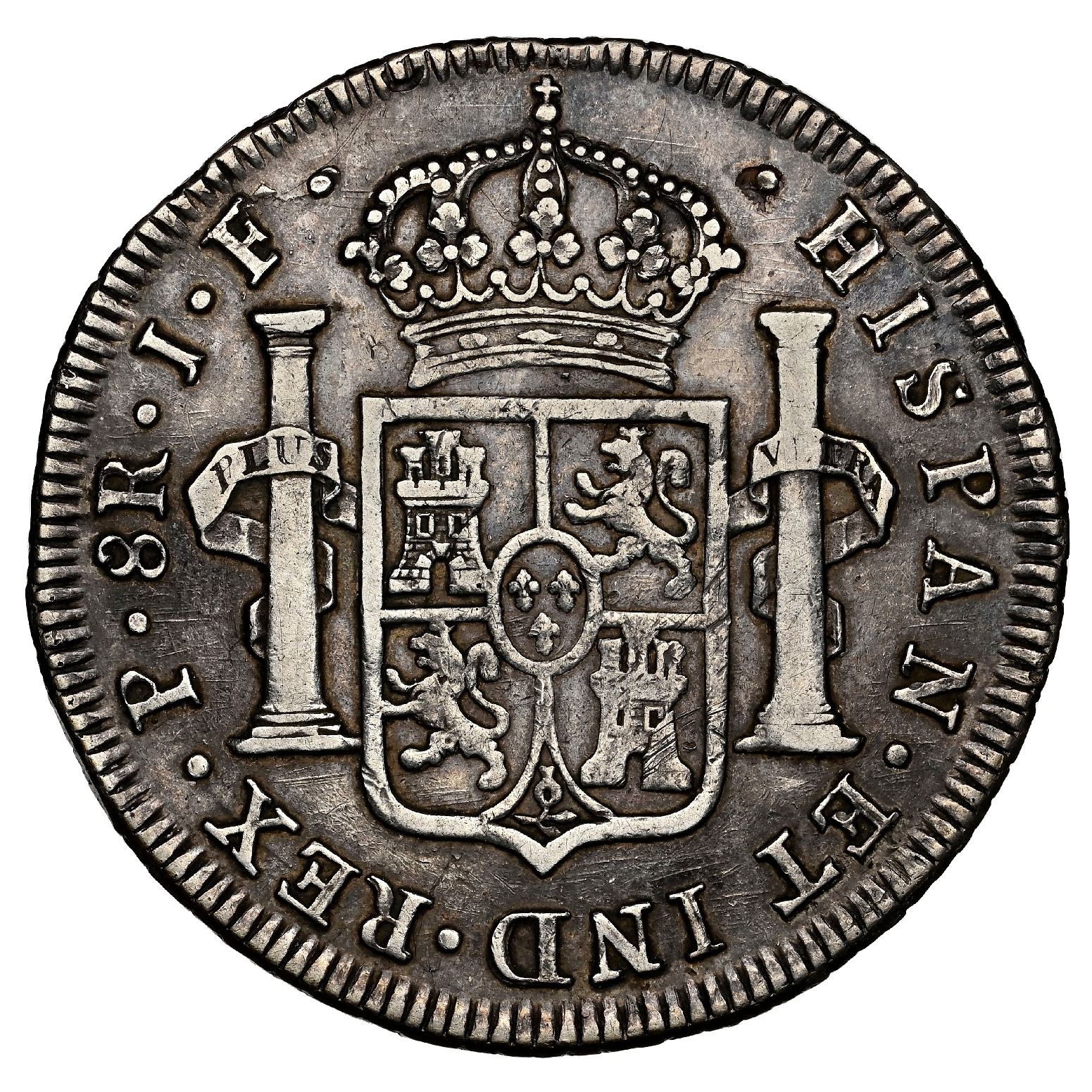 Popayan, Colombia, bust 8 reales, Ferdinand VII (bust of Charles IV), 1813/2 JF, very rare, NGC VF 30 ("top pop"). Restrepo-120.4; Cal-1364; KM-71. Good contrast with dark toning (including what looks like a fingerprint behind the head), with a few minor marks and flaw in fields, the obverse slightly off-center, labeled as non-overdate by NGC but with clear 3/2 (tied with one other 1813/2 at NGC, bettered by Eldorado's AU50 at PCGS), either way the rarest date in the series after 1820. Pedigreed to the Gregorio Toulemonde Collection (stated on label).