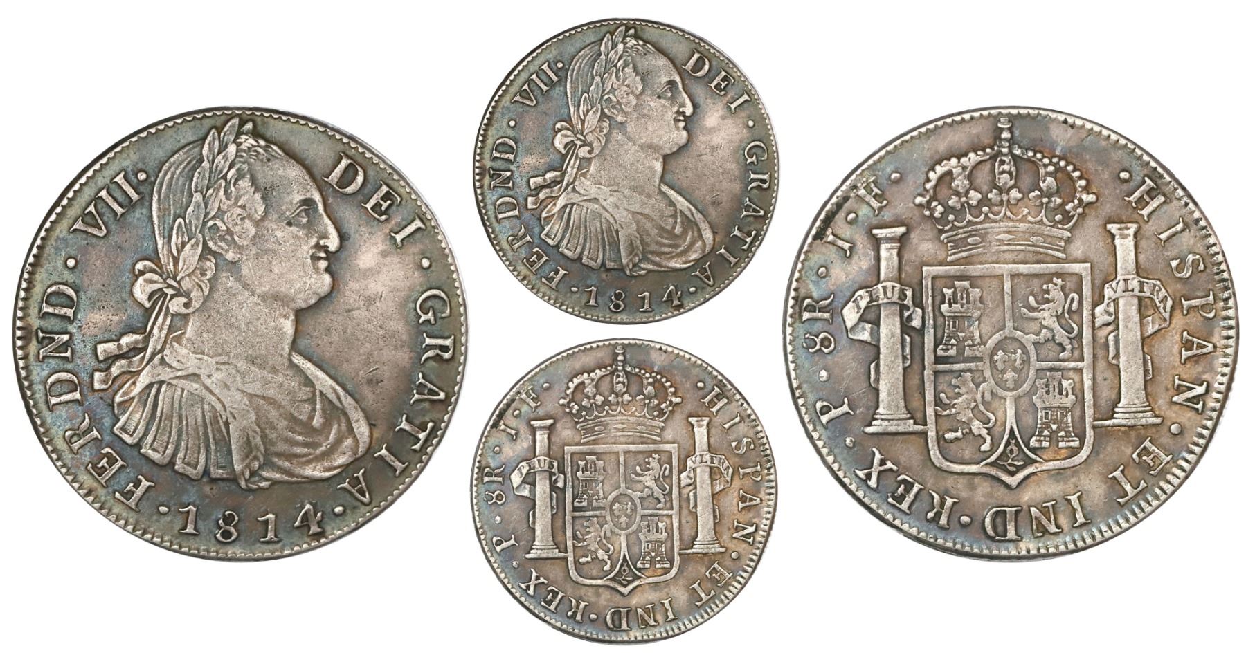Popayan, Colombia, bust 8 reales, Ferdinand VII (bust of Charles IV), 1814/3JF, PCGS XF40, Restrepo Plate Coin (stated on label). Restrepo-120.7; KM-71; Cal-1366. Natural surfaces with deep rainbow toning, nice strike with honest wear for the grade, scarce, with desirable pedigree. PCGS #39227522. Pedigreed to the Nueva Granada Collection (stated on label), and Plate Coin on page 137 of Restrepo's Coins of Colombia (2012).